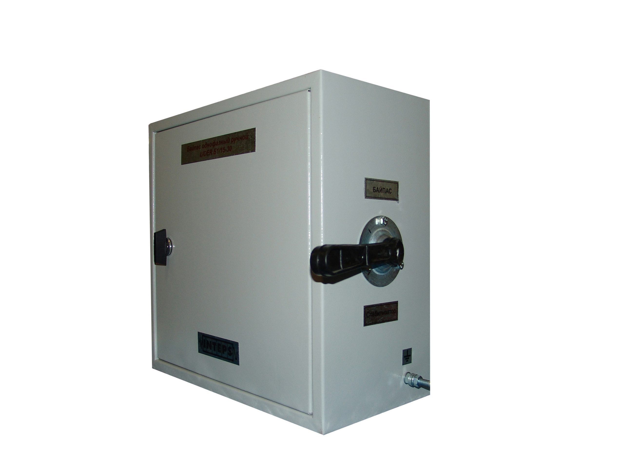 Байпас однофазный ручной Б1/15-30 предназначен для работы с однофазным стабилизатором мощностью от 15 кВА до 30 кВА. Байпас размещен в металлическом ящике с дверцей. На задней панели корпуса имеются отверстия, позволяющие навесить устройство на стену. Подключение устройства к сети и нагрузке производится с помощью клеммных колодок, расположенных за дверцей корпуса.